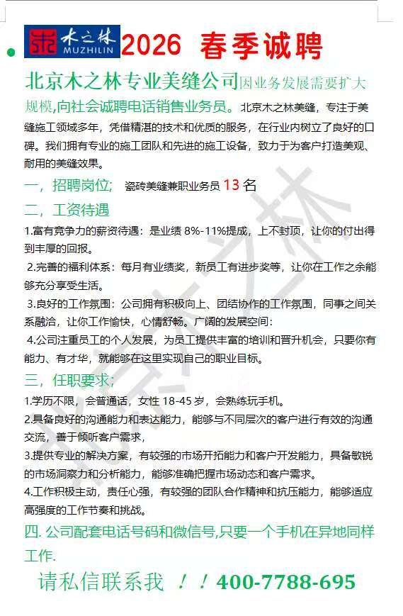 招聘瓷砖美缝兼职业务员